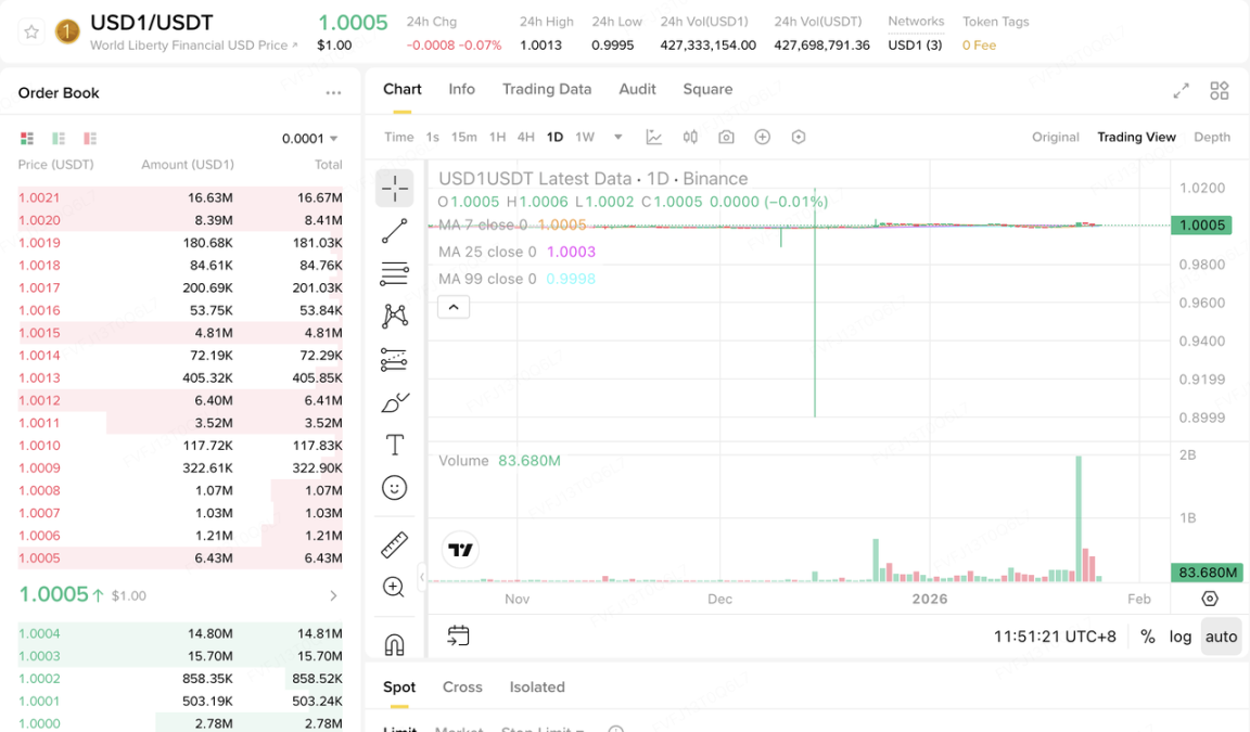 链上流动性方面,稳定币总量阶段性回落:单周总流通量减少 $26.38B,跌幅约 0.85%。结构上,World Liberty Financial USD(USD1)表现突出,单周上涨约 35%,与 1 月 23 日币安宣布延续 USD1 生态激励政策密切相关——币安将开启为期四周的 4,000 万美元 WLFI 空投计划,奖励在币安现货、资金账户、杠杆与合约账户中持有 USD1 的用户。受此影响,币安 USD1 现货较 USDT 由负溢价转为正溢价 0.19%。此外,据 Arkham 数据,Binance 关联地址的 USD1 持有量占比高达 77%。当前风险偏好走弱的环境下,“激励驱动的结构性增量”与“市场整体流动性回落”并存。