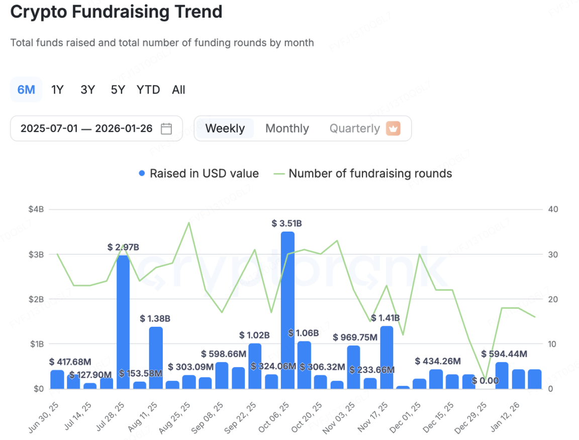 上周一级市场融资披露约 16 起、总金额维持在 ~$400M 附近,整体延续“总量低位、结构后移”的格局:大额资金更集中在 IPO、RWA/ 合规基础设施等“可验证现金流 / 合规可落地”的方向,而早期高 FDV 叙事型项目的融资边际继续收缩。在这一背景下,两笔指示意义的大额事件分别落在 “加密 IPO 窗口” 与 “RWA/ 证券上链基础设施再融资” 两条主线上。