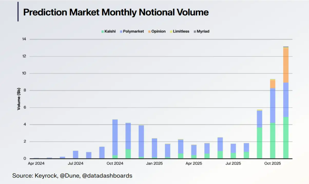 预测市场正经历指数级爆发——2024 年初至今,月度名义交易量从不足 1 亿美元飙升至超 130 亿美元,增长 130 倍。
