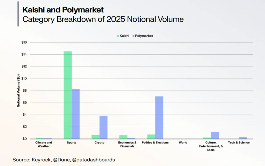 Kalshi 上,政治、选举与经济三大类别合计未平仓合约为体育类的 2.5 倍;