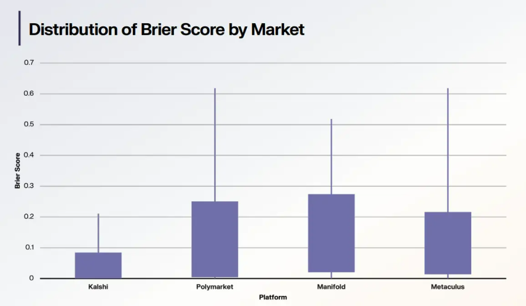 在衡量预测校准度的 Brier Score(越低越好)上,Polymarket 与 Kalshi 均维持在较低水平。作为对比,美国大选民调的典型 Brier Score 为 0.15–0.20,专家判断在复杂地缘事件中的表现往往更差。