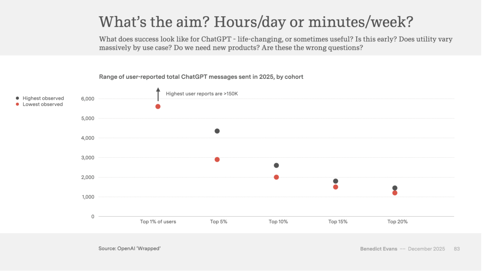 Evans 指出,OpenAI 当前的商业模式并不具备明确的竞争优势。该公司既没有独特技术,也没有形成网络效应,其 9 亿周活跃用户中仅 5% 付费,且 80% 用户在 2025 年发送的消息少于 1000 条——相当于每天平均不到三次提示。这种「一英里宽、一英寸深」的使用模式表明,ChatGPT 尚未成为用户的日常习惯。