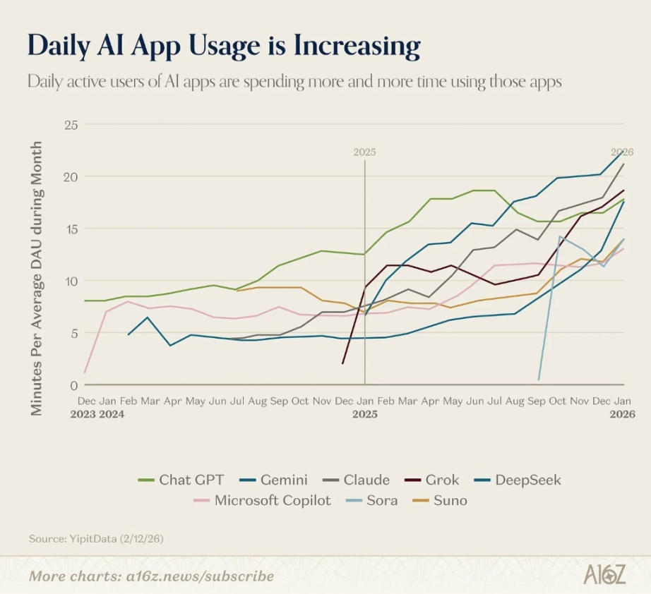 根据 YipitData 最新发布的数据显示,全球核心 AI 应用的用户黏性正在发生质的飞跃。数据曲线直观地反映出,不仅 ChatGPT、Claude、Gemini 等主流大模型的单日活跃用户平均使用时长(Minutes Per DAU)呈现整体陡峭的上升趋势,纷纷逼近或突破 20 分钟大关;后续杀出的 DeepSeek 以及多模态代表 Sora,更是走出了近乎垂直的爆发势头。这证明 AI 已经无可辩驳地嵌入了大众的真实生产工作流,用户在为其投入实打实的“时间成本”。
