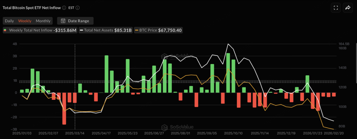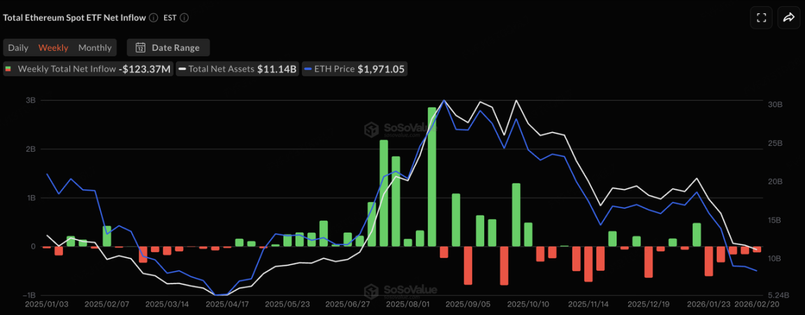在 ETF 资金面上,需求仍然脆弱。美国现货 BTC ETF 已连续 5 周录得净流出,机构资金更多体现为阶段性去风险而非趋势性增配;截至上周末,BTC 现货 ETF 总净资产约 $85.31B。 以太坊侧也处于类似的“弱资金—弱价格”共振区间:根据 SoSoValue 口径,截至 2/20(美东),ETH 现货 ETF 总净资产约 $11.141B,资金流同样偏反复。