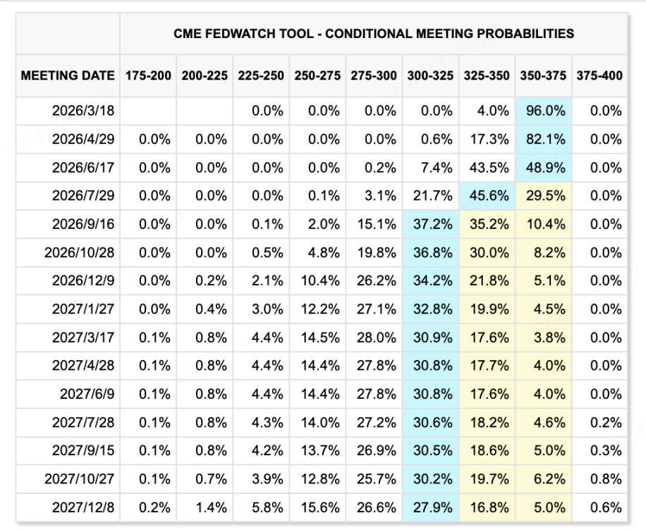 利率预期方面,市场对“年内两次降息”的大方向并未彻底改变,但首次降息的定价明显后移:在增长数据走弱与通胀读数偏韧的拉扯下,市场对更早窗口(如 6 月)的押注有所降温,交易层面更倾向把“第一次真正的降息落点”放在 7 月前后去观察。