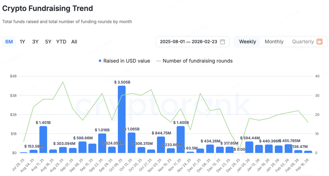 CryptoRank 统计口径下,本周披露融资总额 $112.2M、共 16 起融资事件,其中最大的一笔 Novig 融资 $75M,占到全周金额约 67%。这也意味着,除去头部交易后,其余项目的单笔体量整体偏小,一级市场的“分散叙事”并没有显著带来资金面回暖,更多是以少数大额交易支撑周度数据。