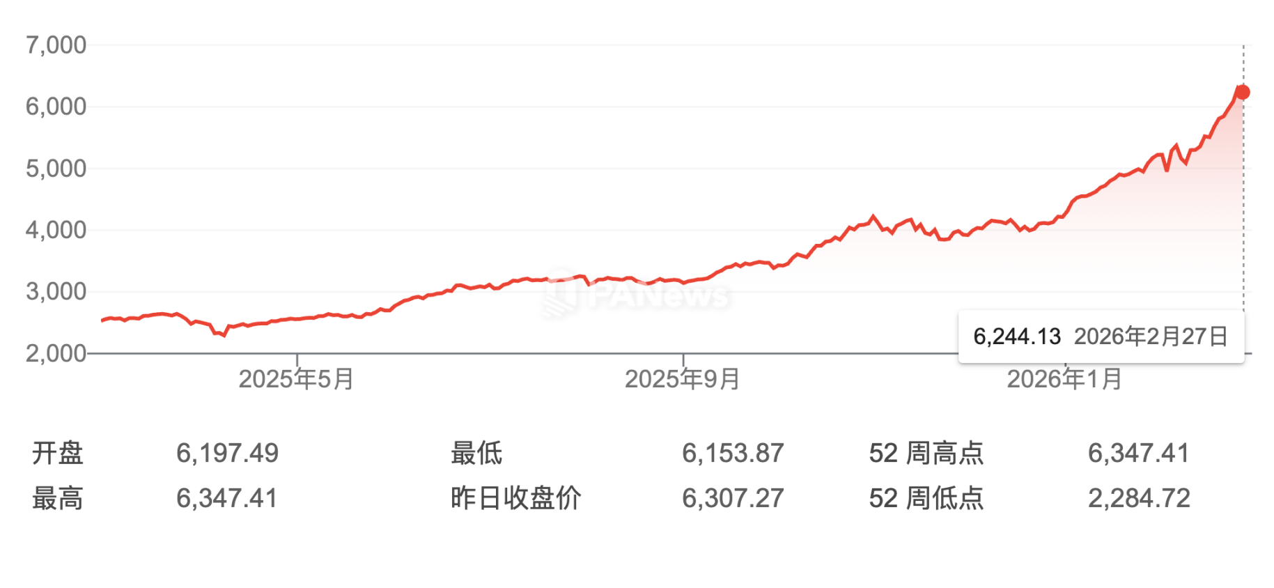 2 月 25 日,KOSPI 盘中首次突破 6000 点;次日,其又首次收于 6300 点上方,在过去 11 个交易日中有 10 天录得上涨,连续刷新历史高位。2 月 28 日,三星电子市值突破 1 万亿美元大关,成为首家跻身「万亿美元俱乐部」的韩国企业。