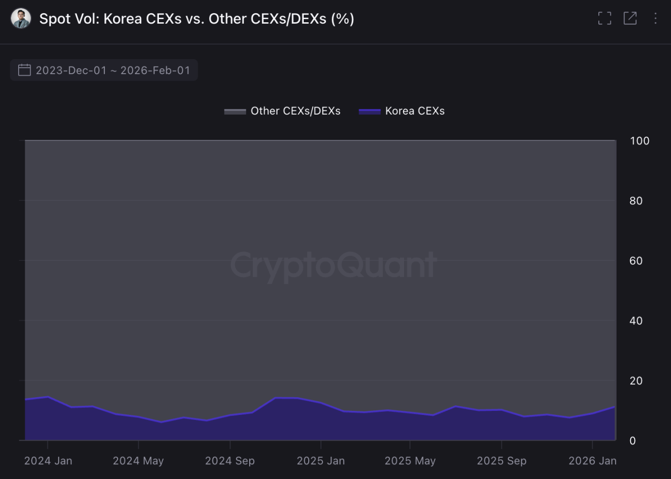 据 CryptoQuant 数据显示,在 2024 年第四季度迎来高峰期后,从 2025 年开始韩国加密市场占全球份额基本一直稳定在 8%~11% 区间。在情绪消极、流动性枯竭的近几个月中,该国市场占全球市场份额出人意料地反而还略有回升。