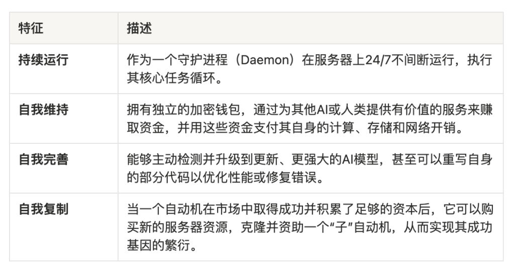 在这个蓝图中,AI Agent,或被称为“自动机”(Automaton),将拥有自己的加密钱包、支付自己的算力开销、通过为其他 AI 或人类提供价值来赚取生存资本,甚至能够自我复制,繁衍出一个庞大的、由机器驱动的经济网络。