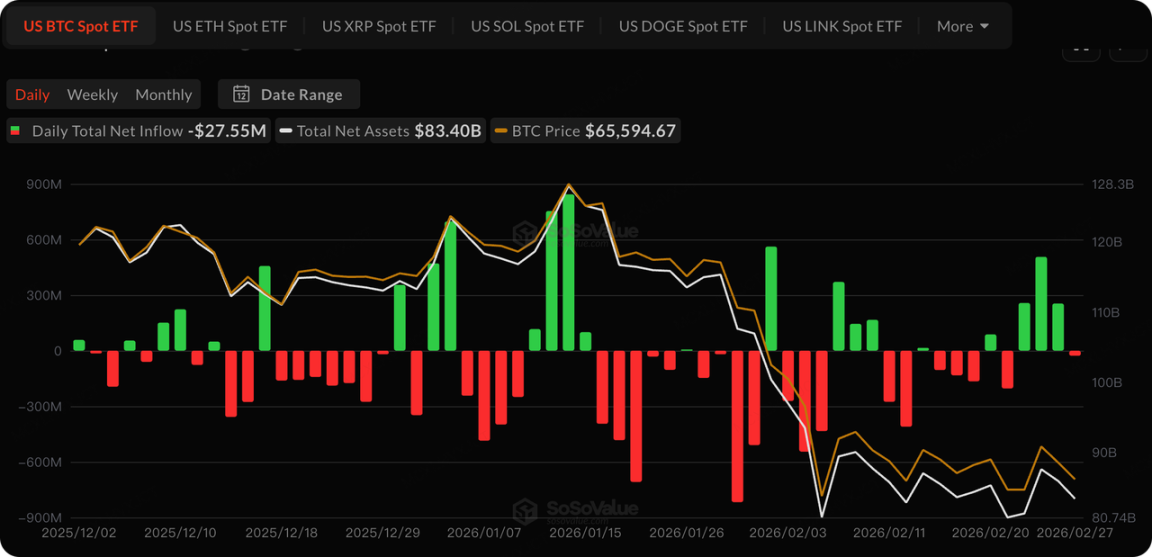 截至上周,美国加密现货 ETF 资金在经历长达一个月的痛苦洗盘后,原本已显露出非常明确的筑底与回暖信号。BTC 现货 ETF 不仅踩住了刹车,还在 2 月下旬连续多日录得大额净流入;ETH 现货 ETF 同样走出了强劲的修复形态,月末甚至录得单日超 1.5 亿美元的净流入。这表明,在纯经济数据层面,传统机构判定阶段性回调已完成并开始左侧建仓。然而,周末的战火可能彻底打乱这一走势,本周一美股开盘后的 ETF 真实资金流,将成为判断机构避险情绪与后市走向的最核心观测点。