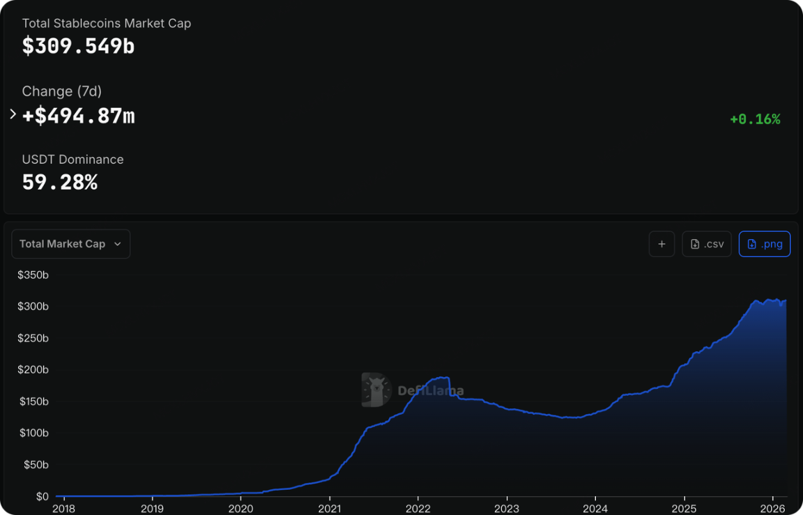 全网稳定币总市值维持在 3,098 亿美元附近,整体规模略有扩张。值得注意的是其内部的结构化调整:资金正从去中心化稳定币明显流向相对更加合规的法币抵押型稳定币组合。这表明场内机构资金更多是在进行“降低杠杆、重新配置”的防御性操作,而非从加密市场彻底出逃。