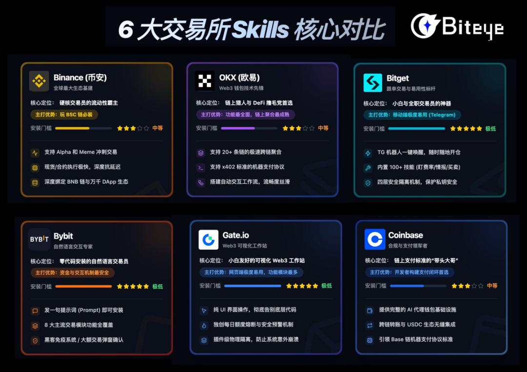 Biteye 从安装门槛、功能亮点、安全机制三大重要维度,把这 6 大交易所的 Skills 扒个底朝天。文末还附带了精选「神级」第三方 Skills,建议先收藏再看。